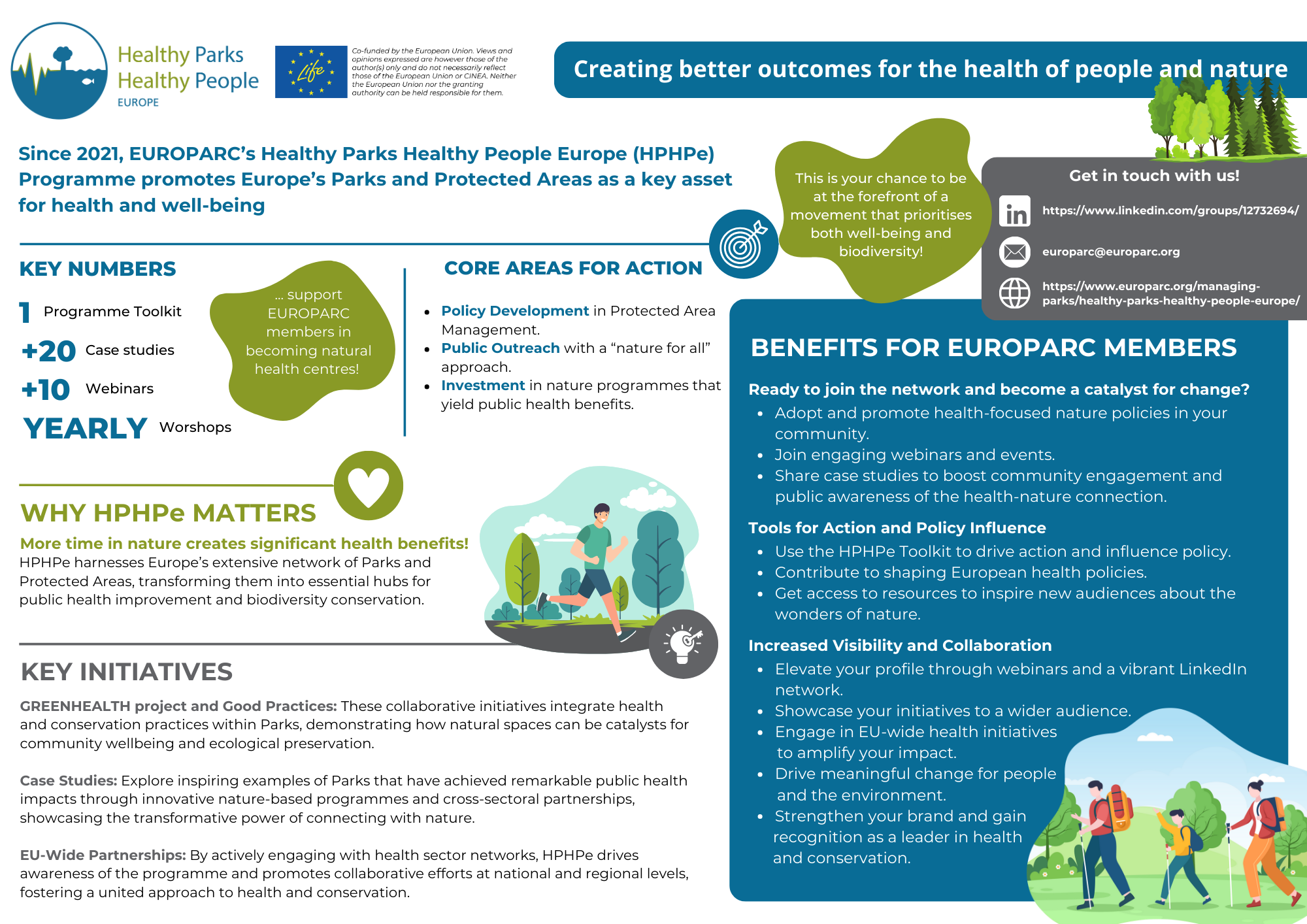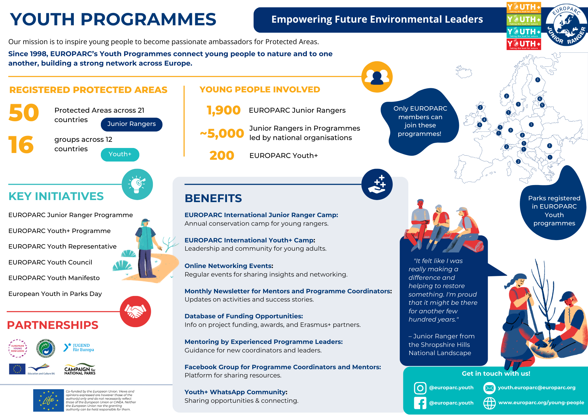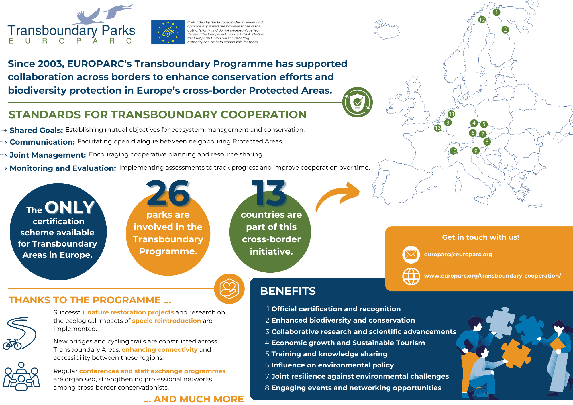 The EUROPARC Federation is Europe’s largest network of Protected Area professionals. Established out of curiosity and a shared desire to learn from one another, we have been connecting people and Parks for over 50 years. Through our projects, events, and flagship programmes, we foster collaboration among experts across Europe, helping them enhance their work in nature conservation and sustainable management. Explore our infographics below to learn more about our programmes, or visit our website at www.europarc.org and see how you can get involved!